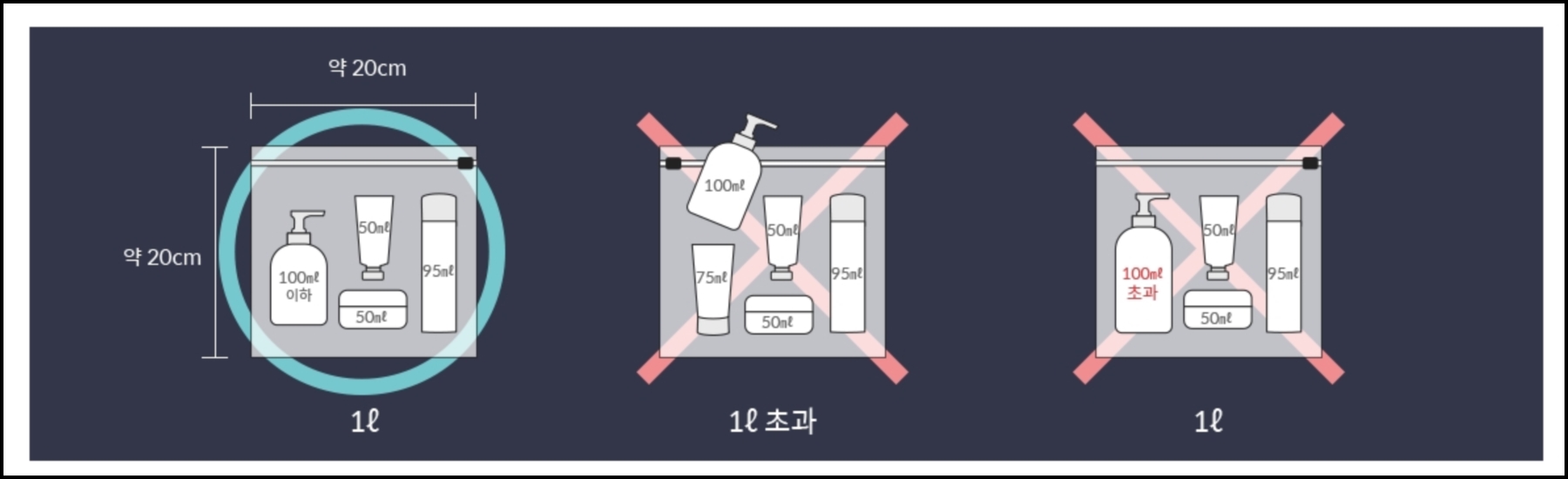 국내선은 비교적 자유롭지만 국제선의 경우 100ml 이하 용량의 액체류만 허용돼요. 1인당 1L 투명 지퍼백 1개에만 담아야 하며, 모든 액체는 별도 보안 검색대에서 검사 대상이에요.