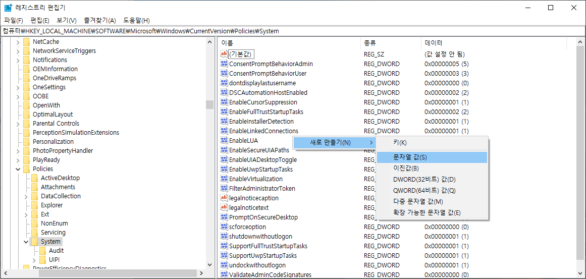 오른쪽 빈 공간을 마우스 오른쪽 버튼으로 눌러 새로 만들기 → 문자열 값을 선택하고 이름을 FilterAdministratorToken으로 지정합니다.
