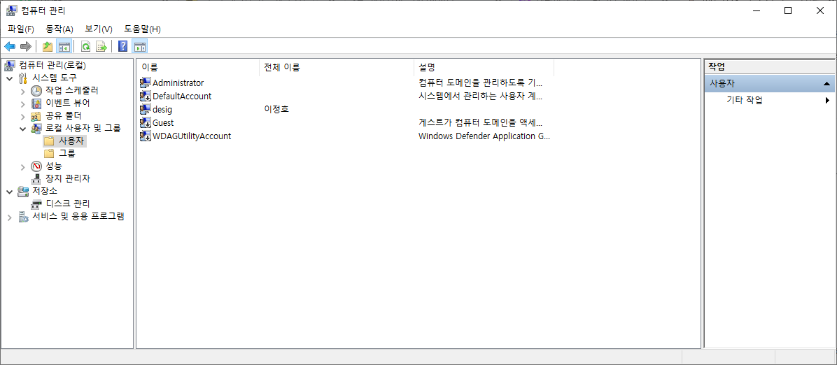 컴퓨터 관리 창에서 시스템 도구 → 로컬 사용자 및 그룹 → 사용자로 이동합니다.