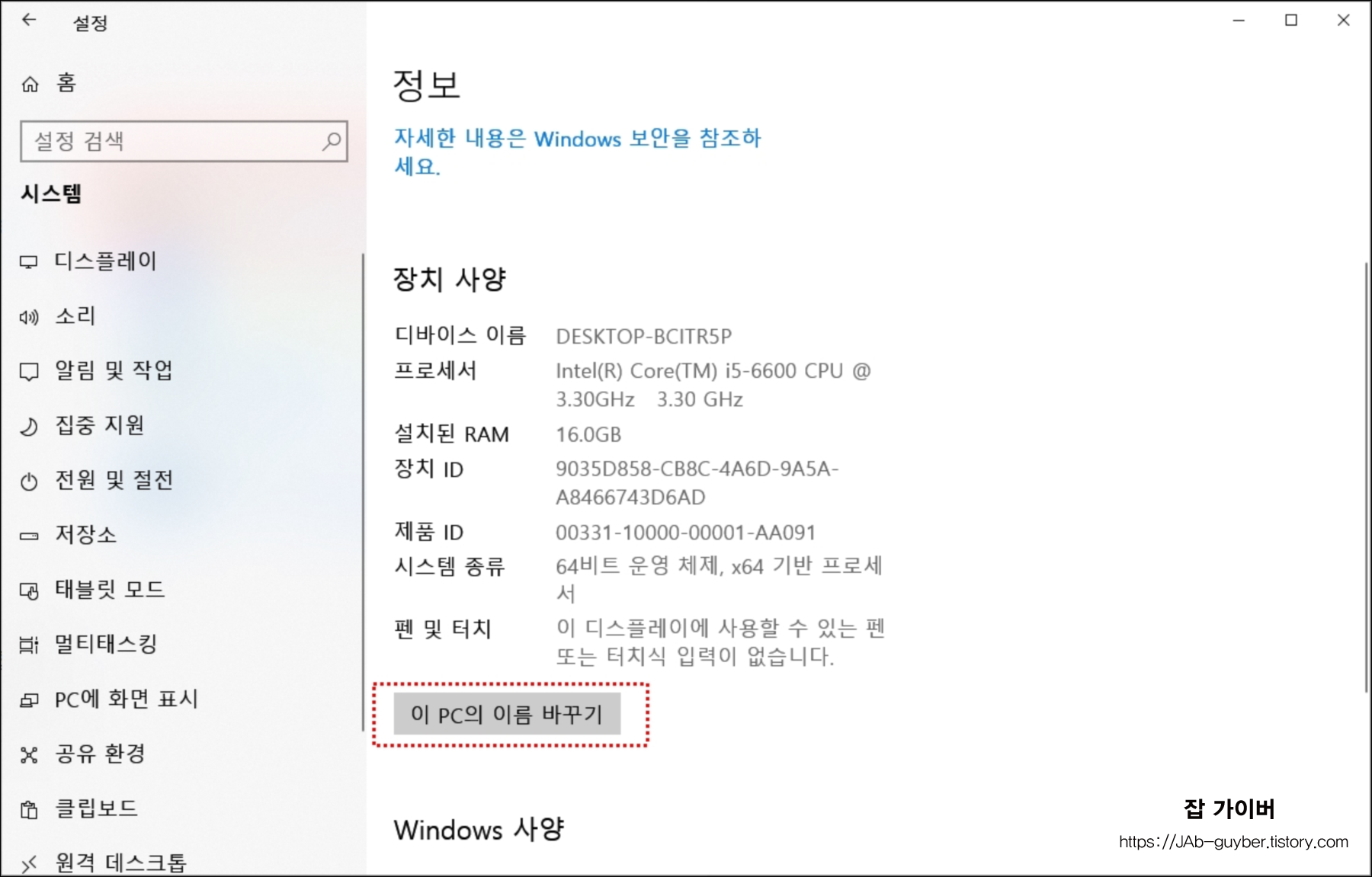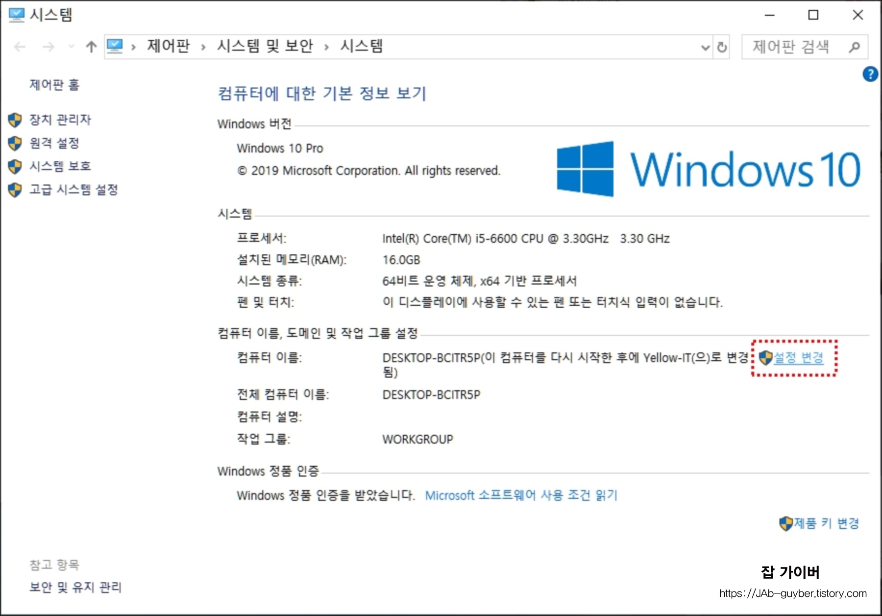지원 종료와는 별개로, 윈도우10 컴퓨터 이름 변경 기능은 그대로 동작합니다.