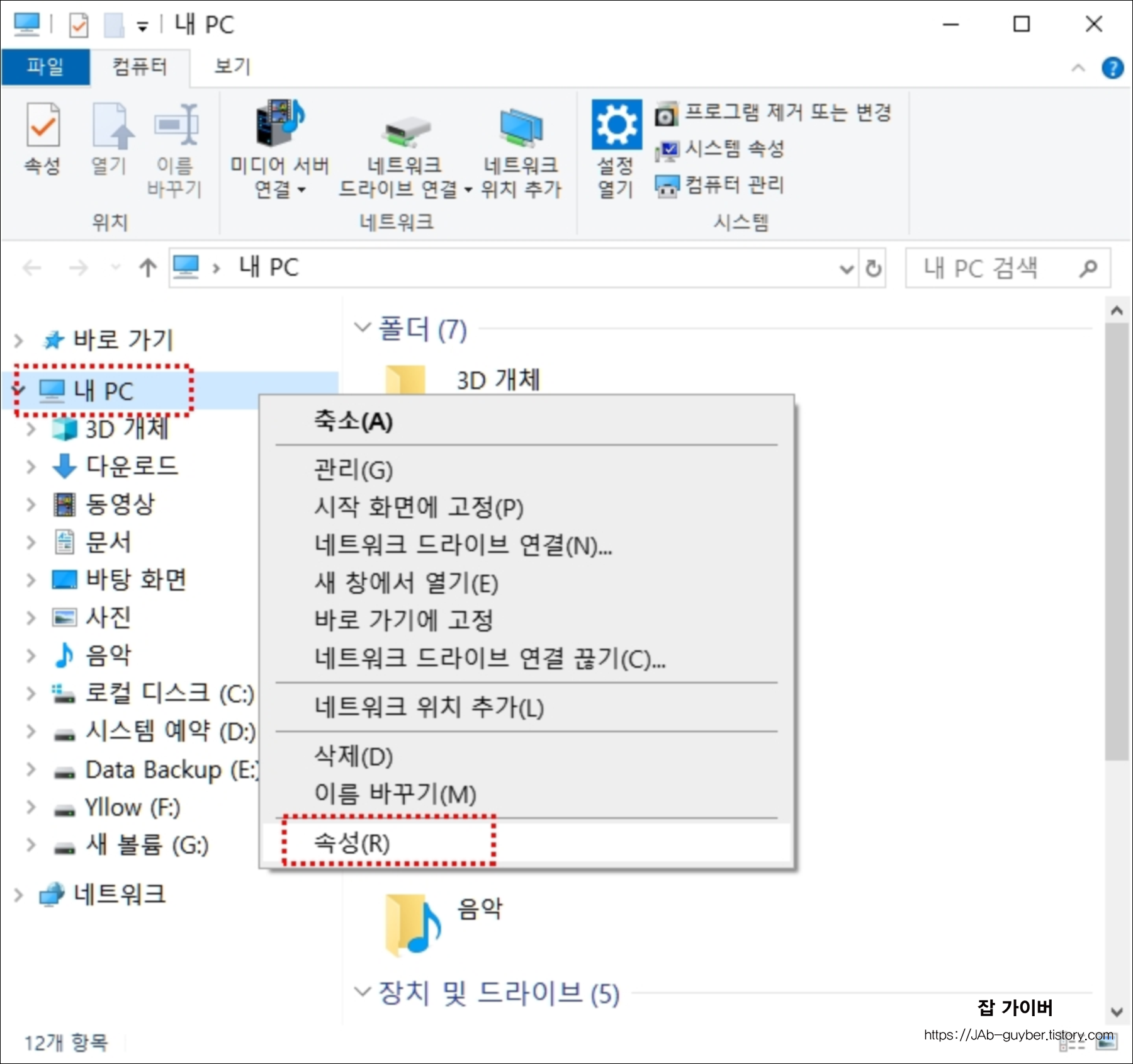 재부팅이 끝나면 바탕화면에서 내 PC를 마우스 오른쪽 버튼으로 클릭하고, 속성을 선택합니다.