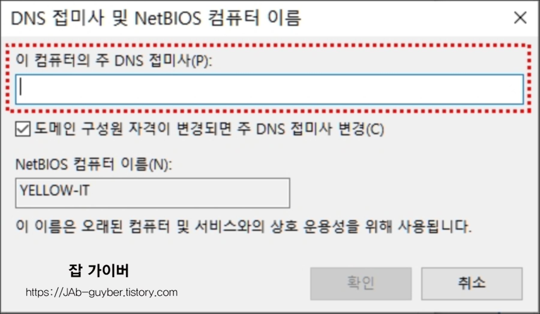 도메인에 가입된 PC에서 이름이나 도메인 정보를 잘못 바꾸면 회사 네트워크에서 로그인 오류가 발생할 수 있습니다.