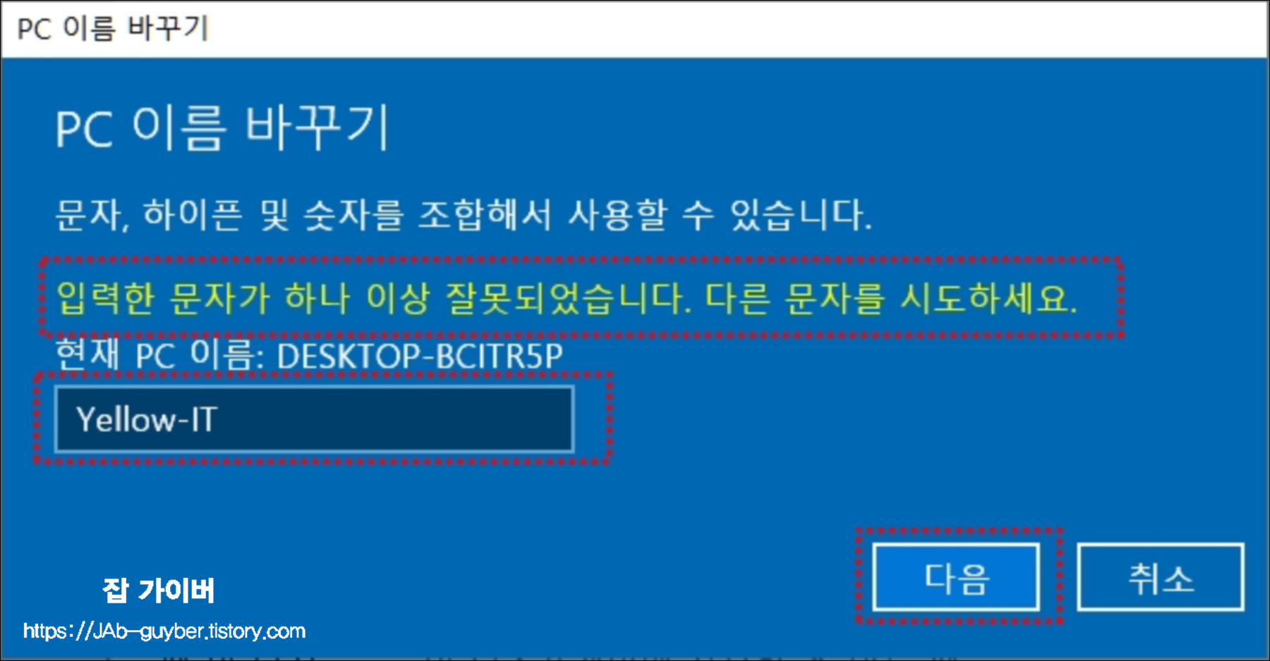 컴퓨터 이름에 빈 공간(스페이스)을 넣으면 “입력한 문자가 잘못되었습니다”라는 메시지가 나타납니다.