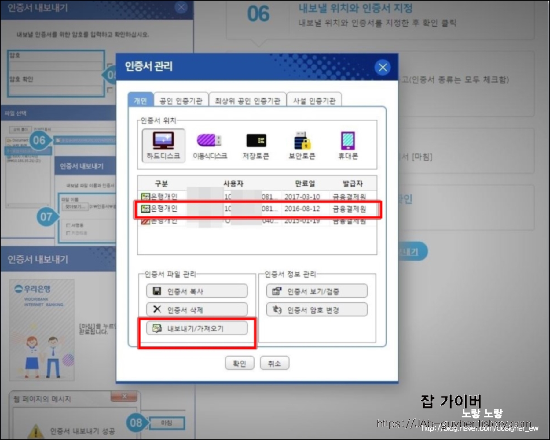 USB 없이 인터넷만으로 옮기고 싶다면 인증서 내보내기·가져오기를, 물리적인 USB·외장하드를 이용해 안전하게 이동하고 싶다면 인증서 복사 메뉴를 선택하면 됩니다.
