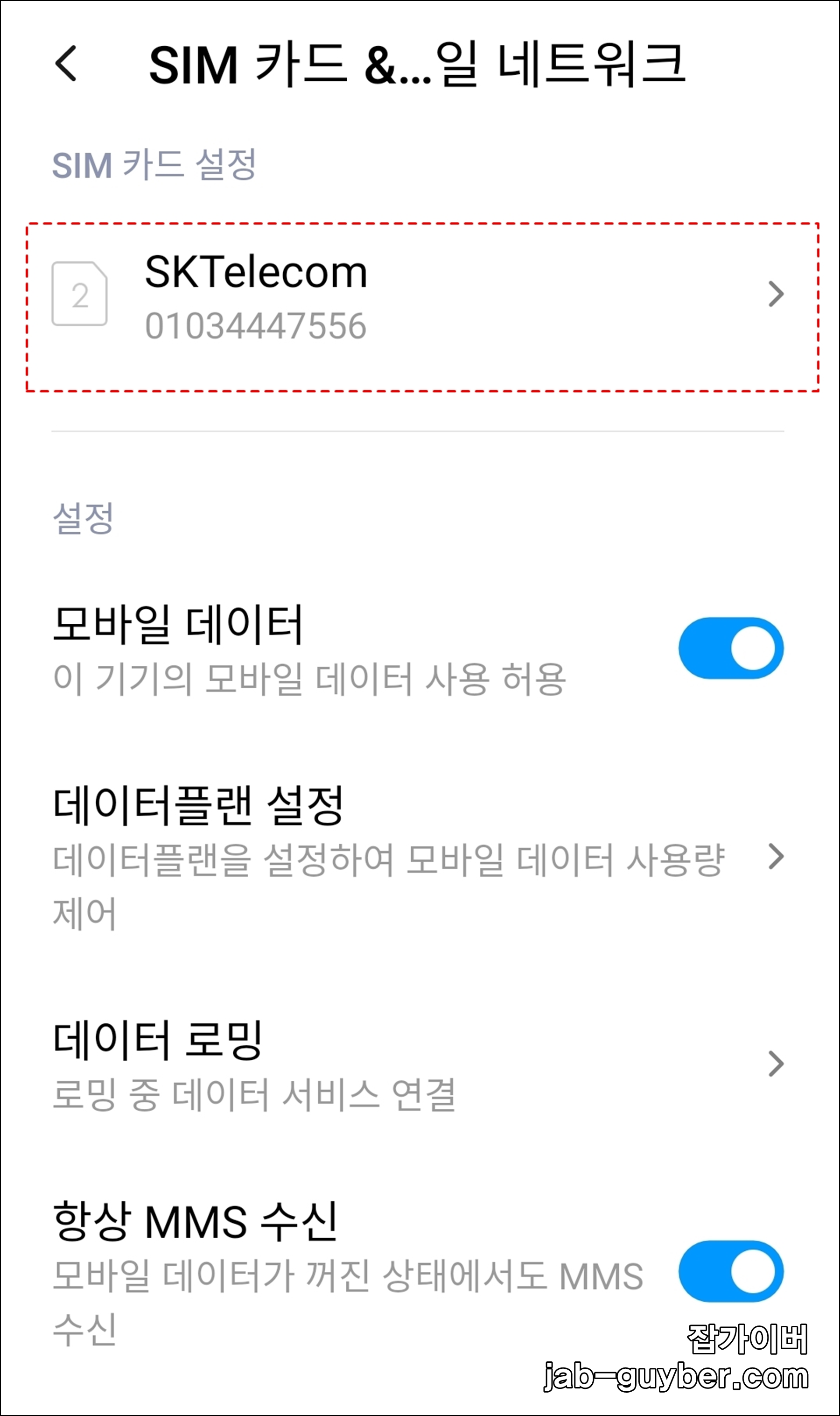SIM 카드 설정에서 자신의 핸드폰 번호를 선택하면 모바일 네트워크 APN 설정이 가능합니다.