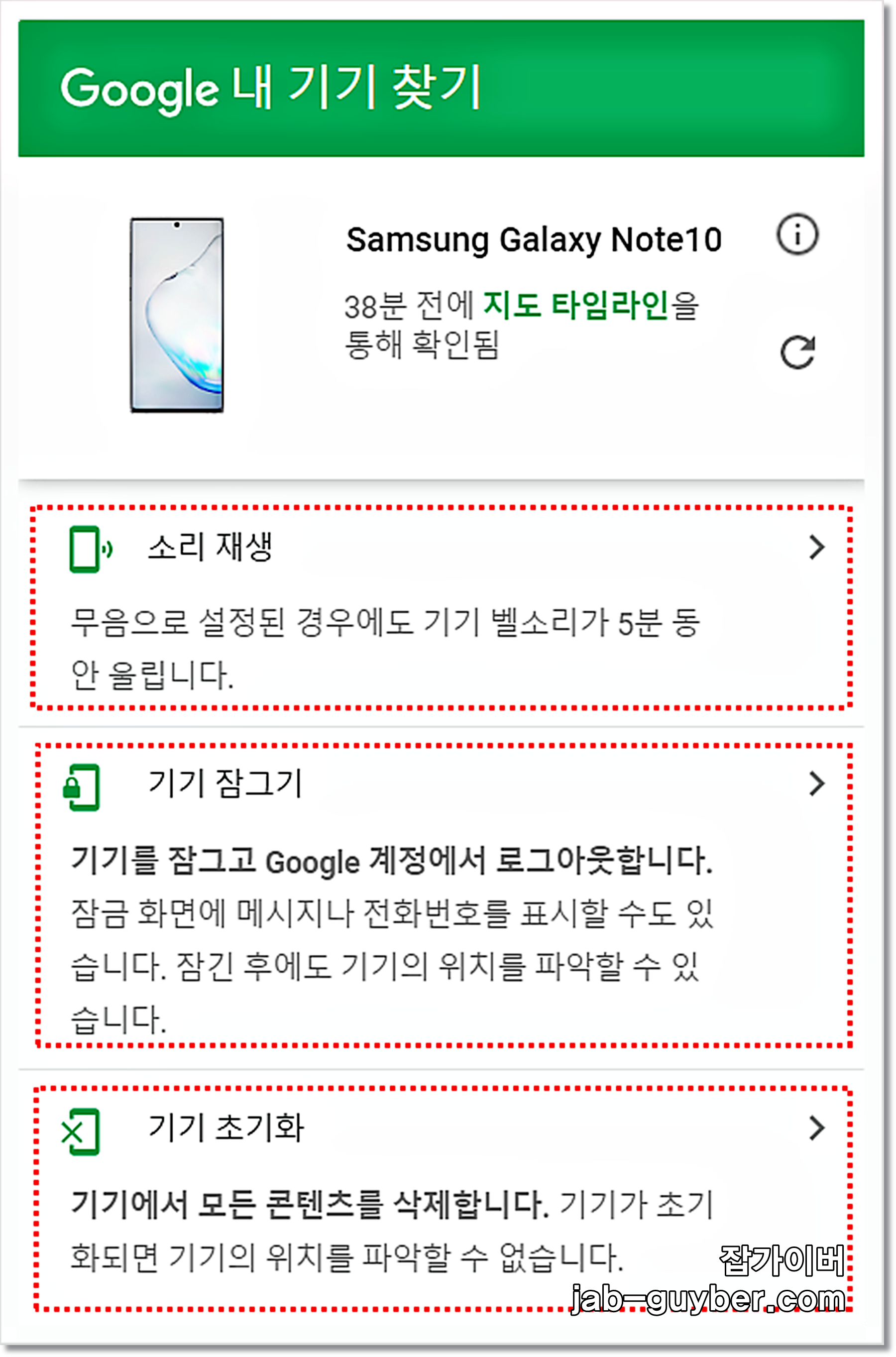 그리고 구글 홈페이지를 통해 핸드폰에 소리를 재생하거나 기기를 잠그거나 모든 정보를 초기화할 수 있습니다.